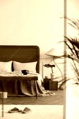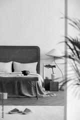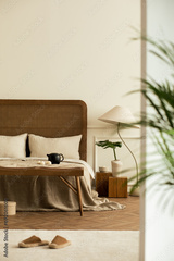 Warm living room interior with cozy bed, beige bedding, lamp, slippers, round box, vase with leaves, coffee table, black pitcher, bench and personal accessories. Home decor. Template.