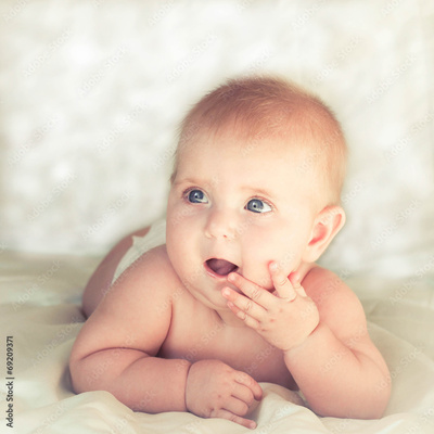 small child looks surprised in the direction. Toned image
