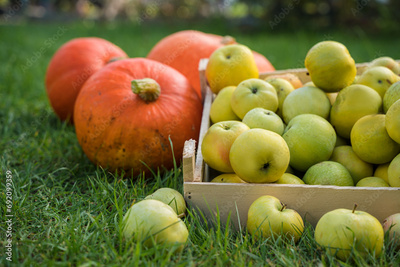 Autumn harvest of apples and pumpkins on the grass, real apples with worm holes and dents