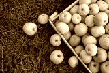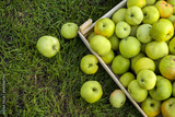 Harvest apples in a wooden box on the grass, real apples with worm holes and dents