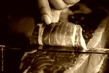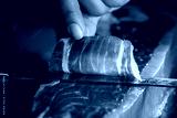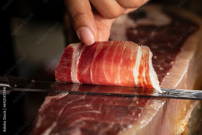 Jamón Ibérico de bellota típico de España. Lonchas de Jamon iberico de bellota para degustación cortadas a cuchillo de jamon iberico español. Preparación de un Jamón Ibérico para comer .