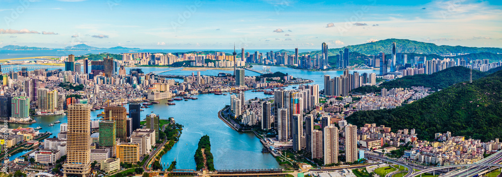 Aerial view of Zhuhai and Macau city skyline scenery at sunset, Guangdong Province, China. Panoramic view.
