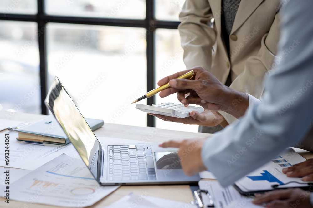 Investment Consultant, Asian business adviser meeting to analyze and discuss the situation on the financial report in the meeting desk office .Financial advisor and accounting concept
