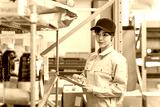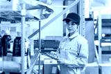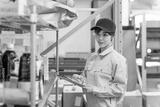 タブレットの倉庫管理システムで在庫確認をする作業員