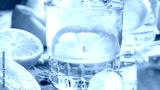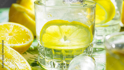 Refreshing drink of water, ice and lemon. Lemonade with ice water and lemons served in a glass with very cold ice.