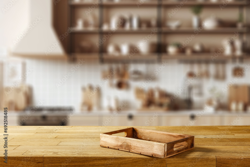 Wooden board with wooden pedestal and free space for your decoration. Kitchen interior with shelfs. Sun natural light and shadows. Mockup place for your products.