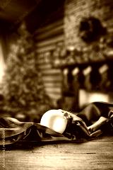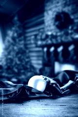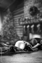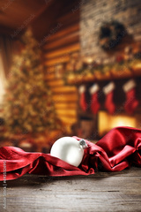 Desk of free space and Christmas ball. Santa Claus home interior.