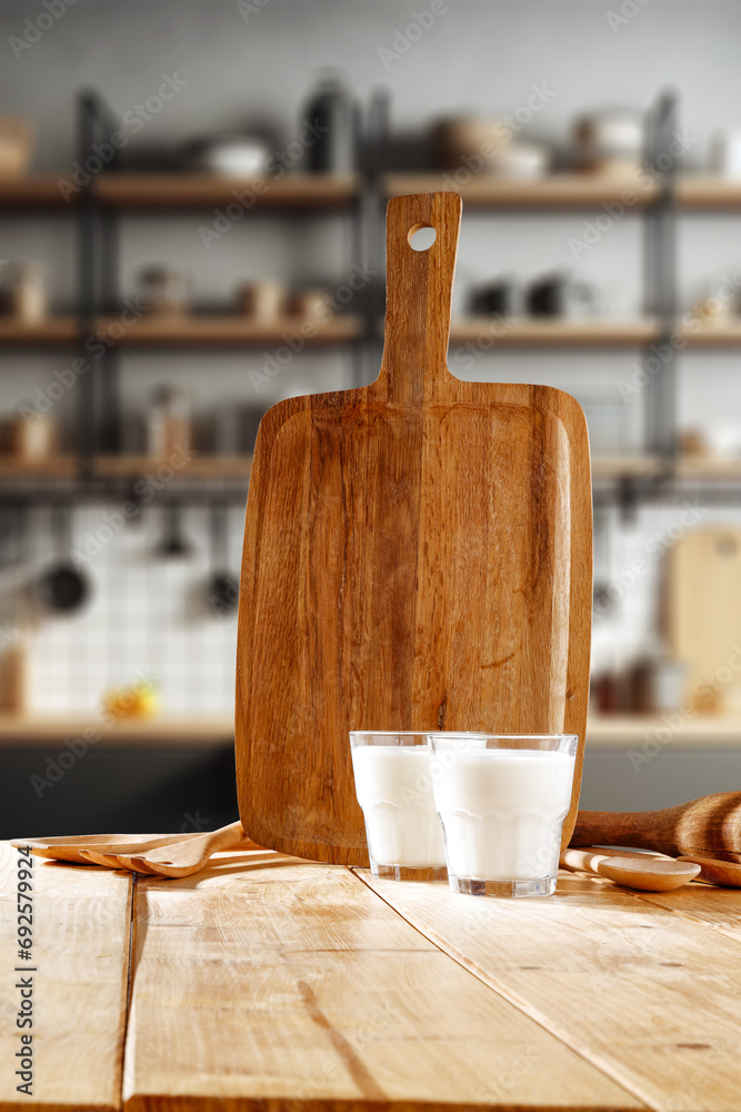 Photo of milk in kitchen interior and yellow wooden desk. Empty space for your decoration and natural sun light. Mockup backdrop and pedestal for yor products.