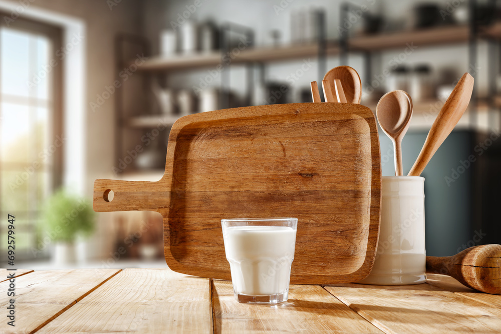 Photo of milk in kitchen interior and yellow wooden desk. Empty space for your decoration and natural sun light. Mockup backdrop and pedestal for yor products.