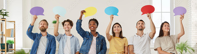 Group of happy diverse mixed race people taking part in public opinion survey, sitting in row, smiling and holding up colorful paper mockup speech bubbles. Banner background