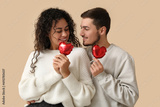 Young couple with air balloons in shape of heart for Valentine's day on beige background