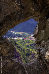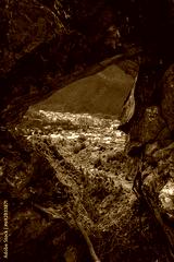 Cilaos vu à travers un trou dans la falaise, route d’Ilet à Cordes