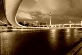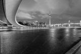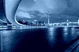 Asphalt road and bridge buildings with city skyline at night in Macau