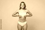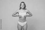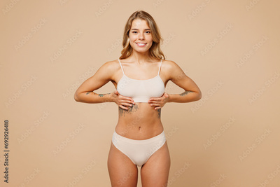Young nice lady woman with slim body perfect skin wear nude top bra lingerie stand put hand on chest cancer early diagnostic isolated on plain pastel light beige background Lifestyle diet fit concept