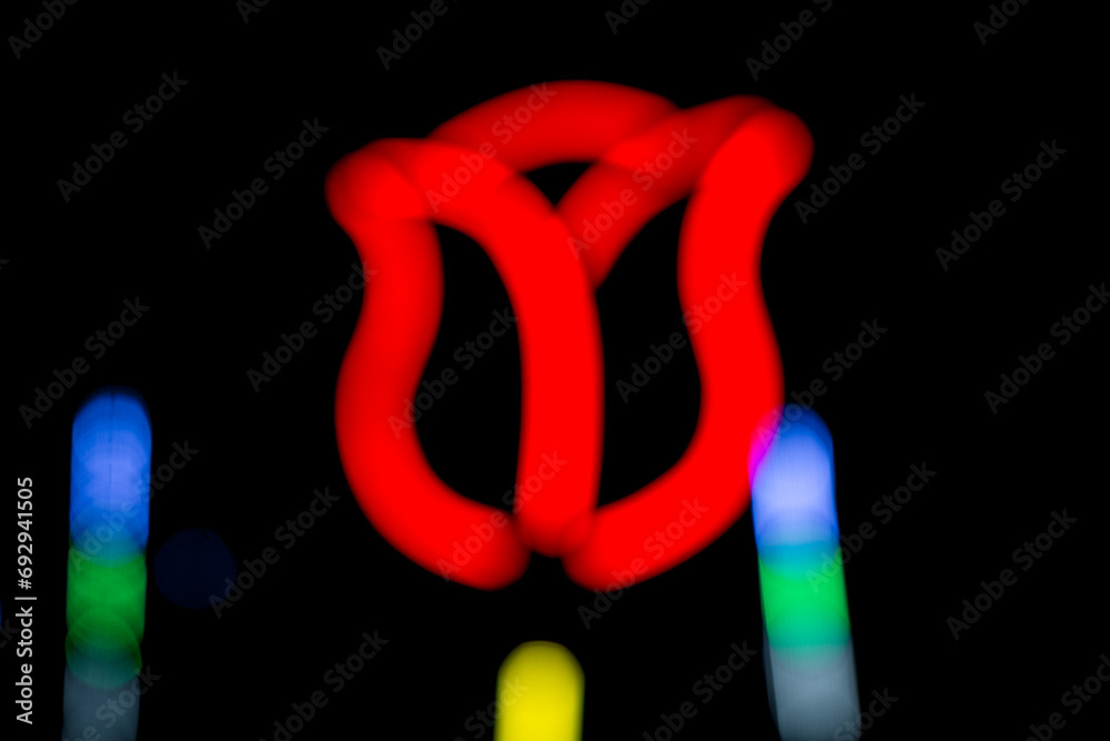 Blur background of neon tulips against a dark sky at night in festival temple fair