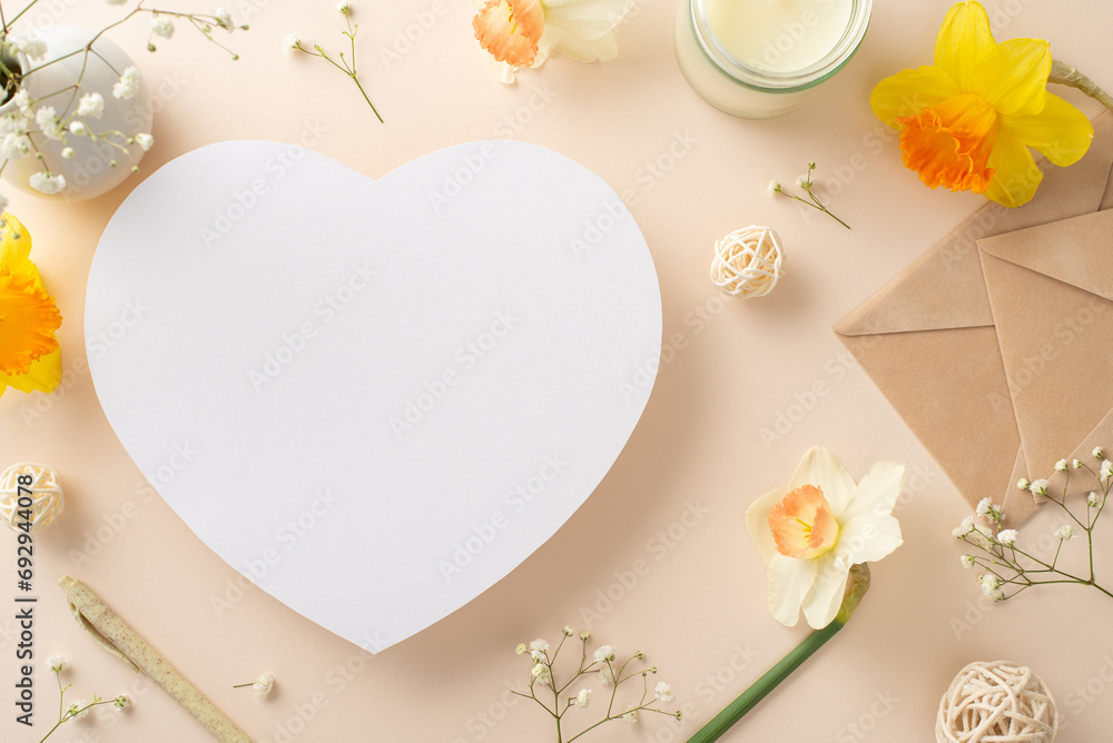 Share the joy of spring festivities with daffodils and gypsophila. From above, observe flower branches and envelope on beige isolated background with empty heart frame ideal for adverts or text