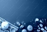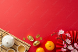 Chinese New Year Banquet Scene: Overhead shot featuring fan, tea ceremony items, bamboo placemat, traditional coins, sycee, Hong Bao, tangerines, sakura on red background. Ideal for festive promo