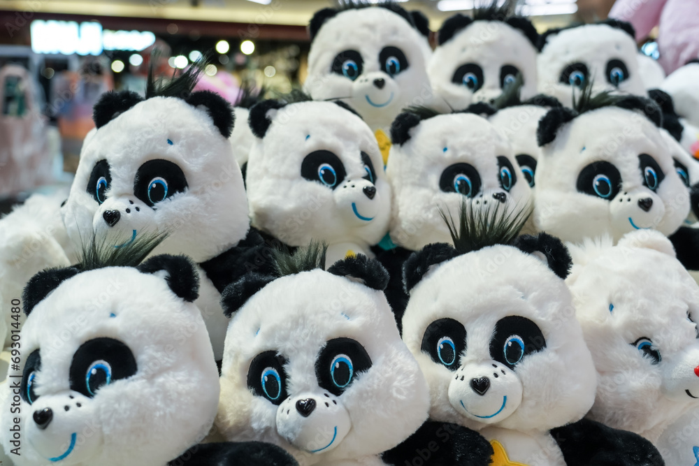 Many lot cute panda heads plush toy on display in a store for children