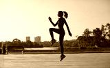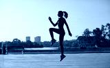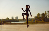 Woman with a slim sporty figure having an outdoor fitness workout on a city street. Side view of a fit healthy young girl in a sports suit, with a ponytail doing a high knee jump exercise