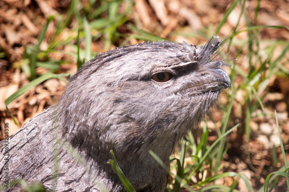 the tawny frogmouth has a mottled grey, white, black and rufous – the feather patterns help them mimic dead tree branches. Their feathers are soft, like those of owls,