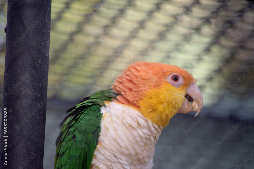 White bellied caique has a white, hooked beaks with pink nostrils on their ceres, a patch of bare skin above bird beaks...