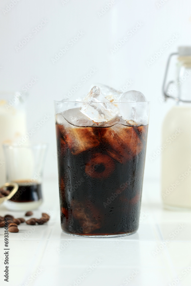Cold Black Coffee with Ice Cubes on a White Background.
