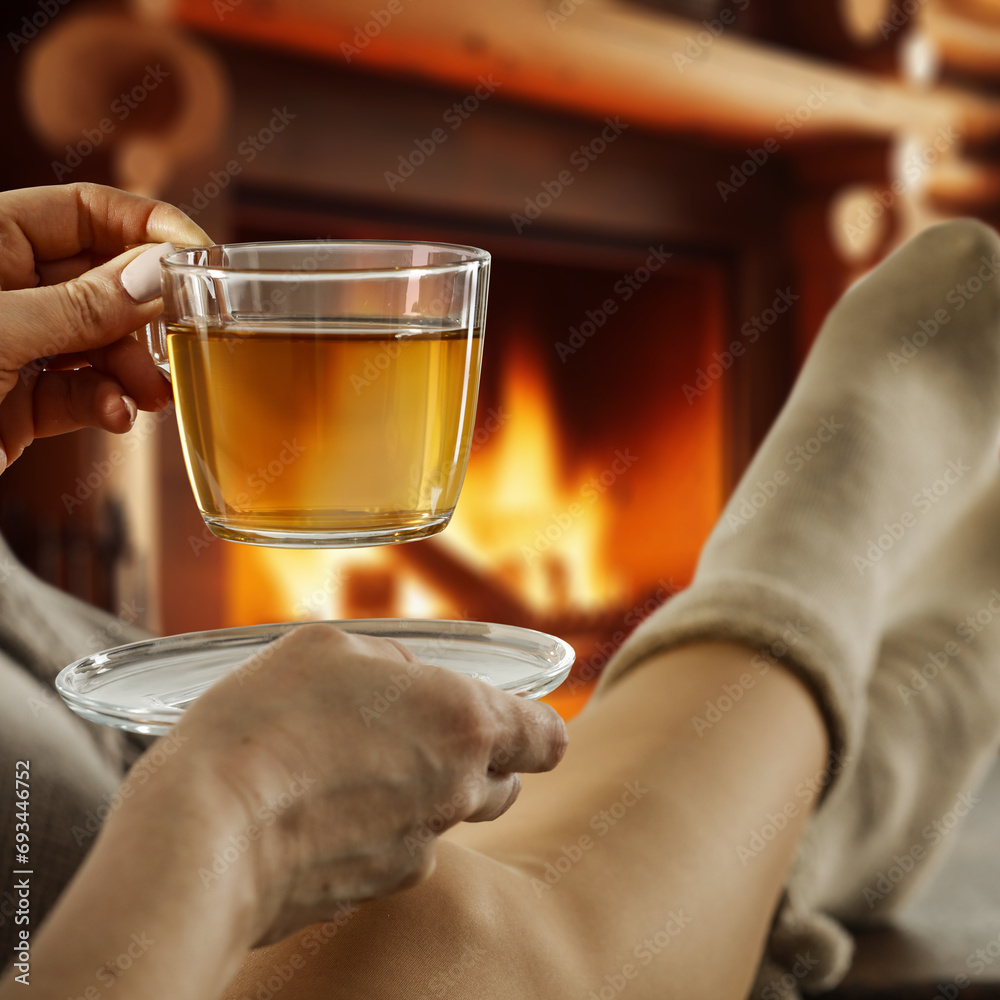 Woman legs with warm socks and home interior with fireplace.