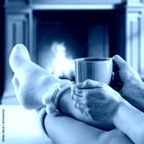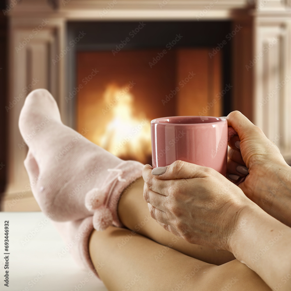 Woman legs with warm socks and home interior with fireplace.