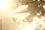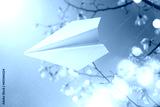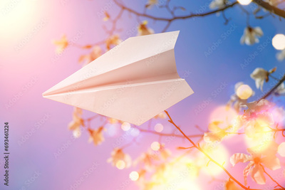 Paper plane with flowers in the background. Dreams, summer, spring concept. Magnolia bloom in spring against the sky. Branches with Large white Magnolia grandiflora flowers close-up view