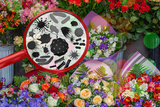Crop view street sale of flowers. Magnifying lens with simulated allergen, germs, allergies pollen and seeds cause acute allergic reactions, and intolerance in humans