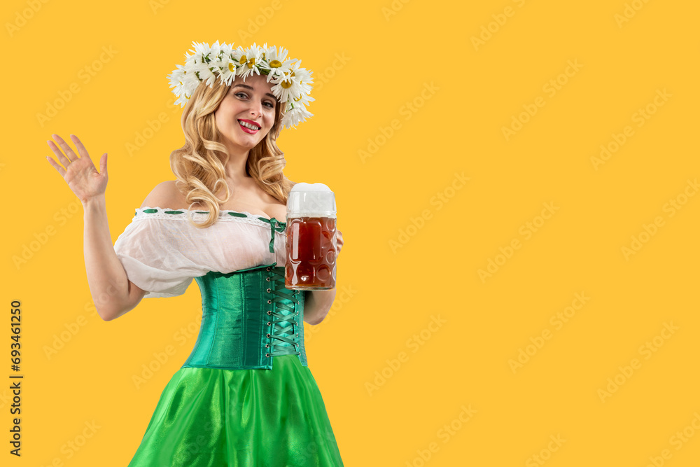 Midsummer woman waitress serving big beer mugs on yellow isolated background. Blonde girl with wreath daisies flowers in her hair celebrating traditional beer festival in summer or spring