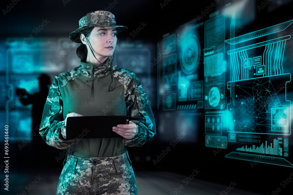 Military Think Tank, AI technology in the army. Warfare analytic operator checking coordination of the military team. Military commander with a digital device with augmented reality operating troops
