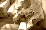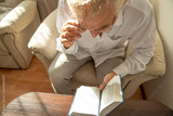 Lifestyle portrait of senior man reading Holy Bible at home. Natural aesthetic light