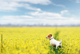 Purebred Jack Russel Terrier puppy hunting in yellow rape flowers meadow. Dog and hunt concept