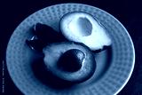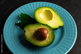 Fresh avocado cut in half on a blue ceramic plate on black board. Healthy eating concept. Food photography