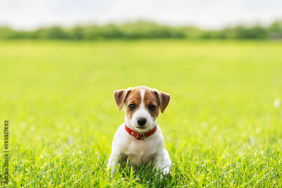 A small Jack Russel Terrier puppy on green lawn. Dogs and pets photography