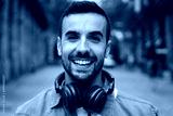 Portrait of a young handsome man smiling and looking at camera. Happy male wearing headphones in street on the city. Close up of a cheerful millennial caucasian guy outdoors.