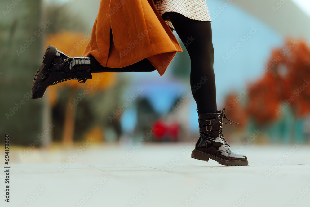 Legs of a Running Woman Wearing Cold Season Boots. Girl in a hurry jumping in patent leather autumn shoes
