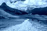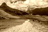 landscape with mountains, hills, clouds, grass and trail