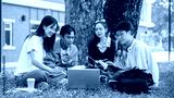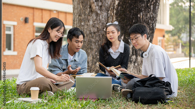 A group of positive Asian students are talking and doing a group project in a campus park together.