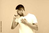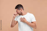Allergy symptom. Man sneezing on light brown background