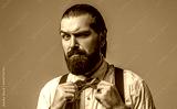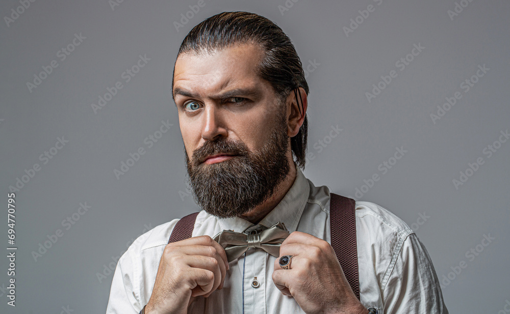 Portrait of handsome bearded man in white shirt and bow tie, suspenders. Close-up of a gentleman his bowtie. Beard man in bow tie and suspenders. Male in shirt correcting his colorful tie