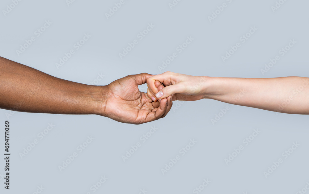 White Caucasian female hands and black african american holding fingers together. Woman and african woman hand. Helping hand, rescue. Helping hands, rescue gesture. Black and white human hands