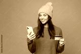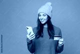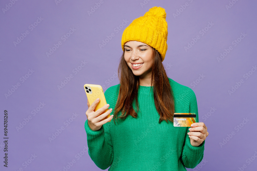 Young woman she wear green sweater yellow hat casual clothes using mobile cell phone hold credit bank card shopping online order delivery booking tour isolated on plain pastel light purple background.