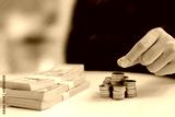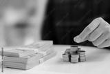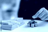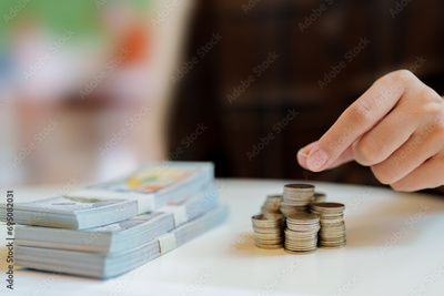 Woman with coin stack. Financial Growing savings concept. Saving money by hand putting coins money accounting planning