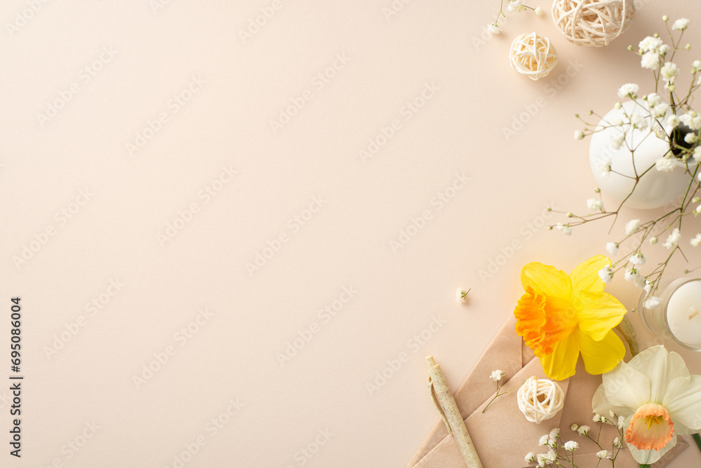 Celebrate the season of new beginnings with a heartfelt spring greeting. Top view picture displays narcissus, gypsophila and envelope on beige isolated background, perfect for adverts or text