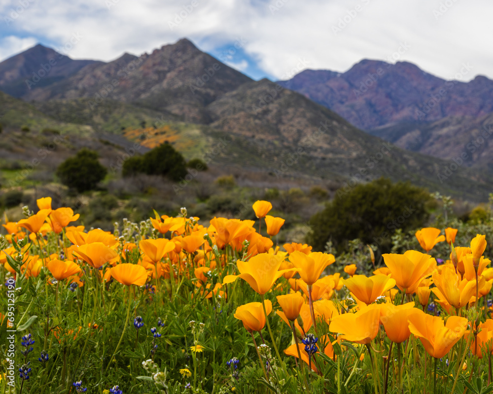 Abundant poppies along Deer Creek trail with the Mazatzal mountains in the background. Near Payson, Arizona.