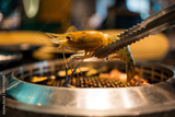 Grilled Prawns on the charcoal grill with tongs. Close up