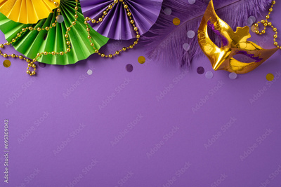 Festive Finery Arrangement: Top view capturing an extravagant New Orleans mask, colorful bead strand, feathers, confetti, and decorative paper fans on lively violet background with space for messaging