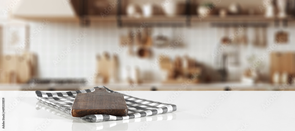 Desk of free space and kitchen interior. Home interior with window.